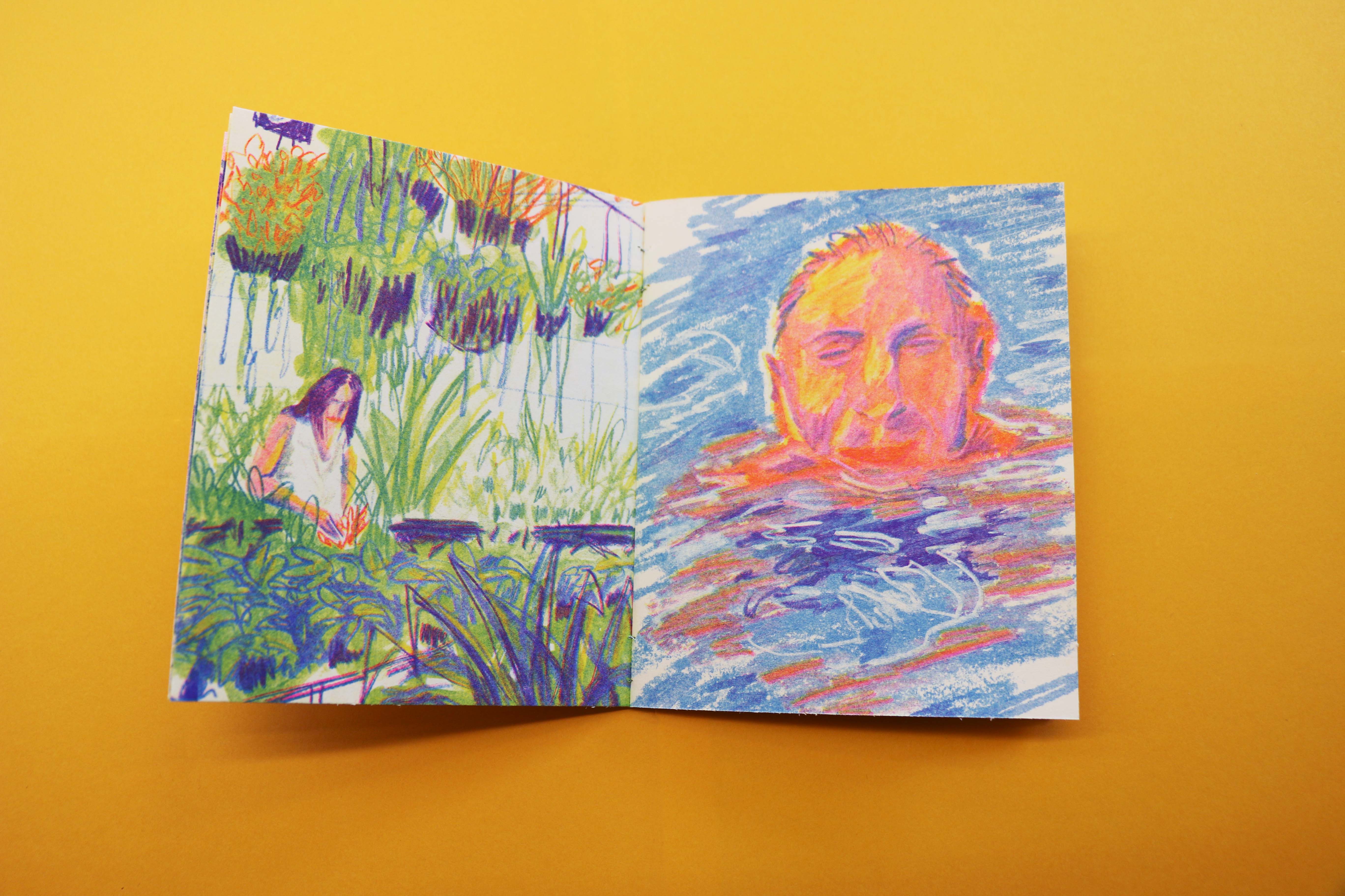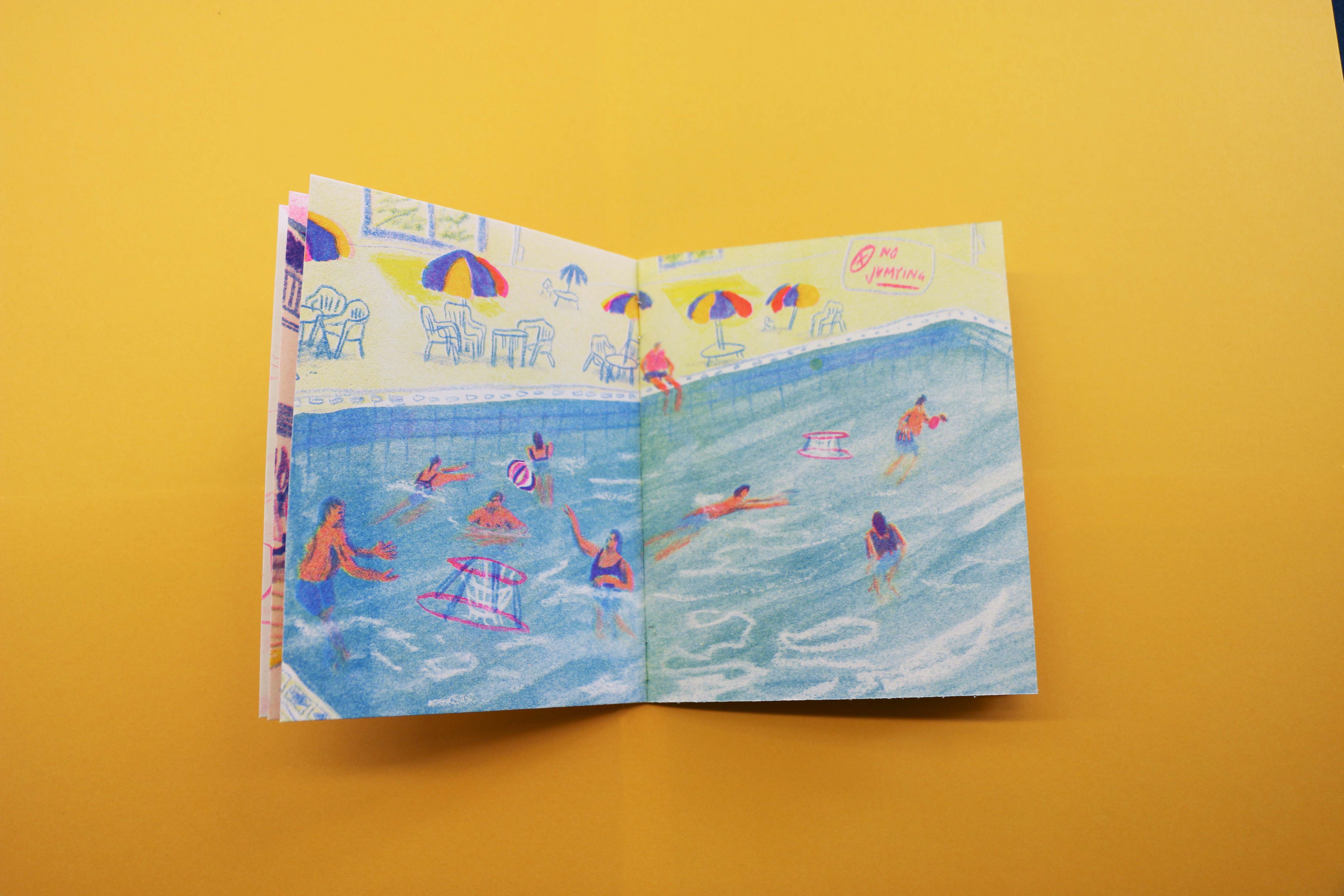 20 pages risographed with Blue, Fluorescent Pink, and Yellow.