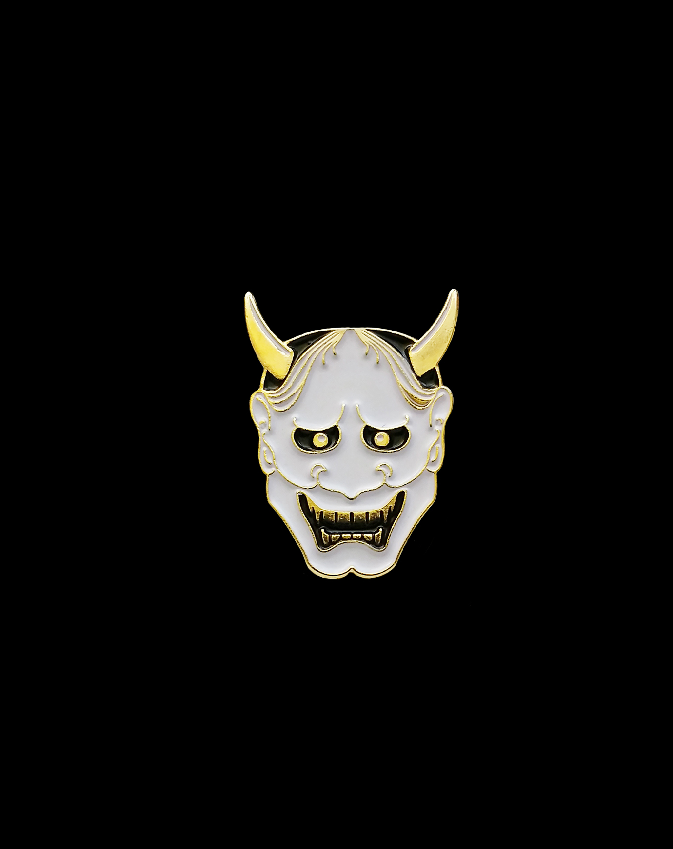 1" soft enamel White Oni Pin with black rubber backing.