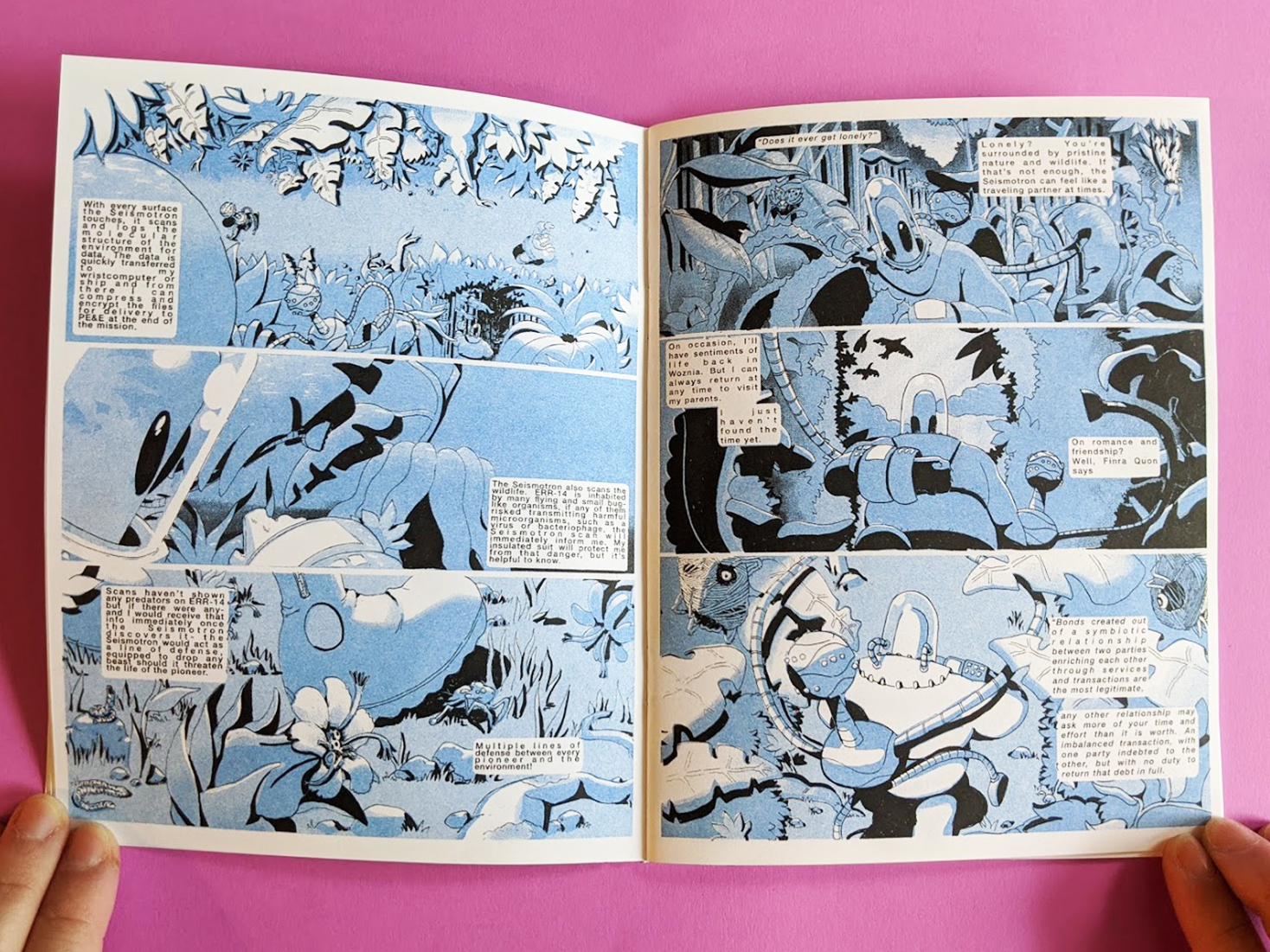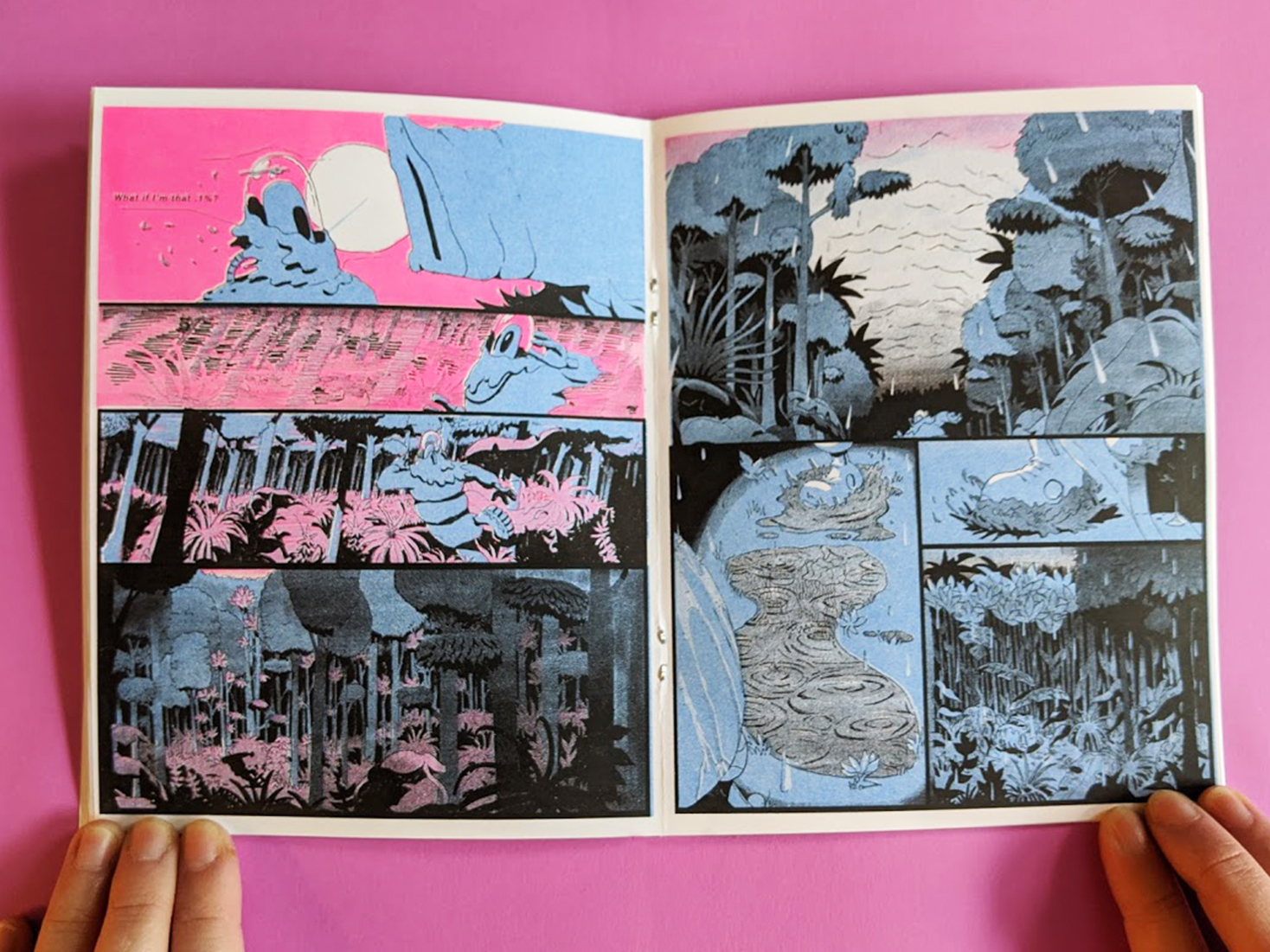 Risographed in Black, Cornflower Blue, and Fluorescent Pink