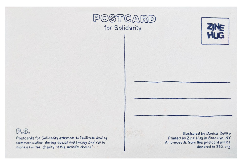 This postcard was created for Zine Hug's Postcards for Solidarity project, attempting to facilitate analog communication during social distancing and raising money for a charity of the artist's choice.